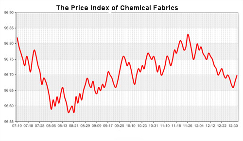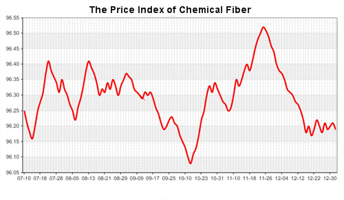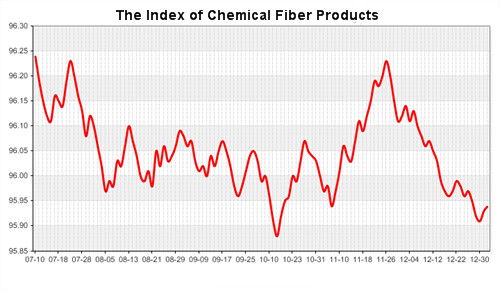 According to the monitor of Chinese Department of Commerce-Shengze Silk Chemical Fiber Index, the indexes of chemical fiber increased. Hereinto, the total index closed at 95.95 points, which increased 0.01 points compared with the previous trading day. The price index of chemical fabrics closed at 97.71 points, which went up 0.01 points. In addition, the price index of chemical fiber continued to decline, it closed at 96.18 points, which dropped 0.01 points compared with yesterday.