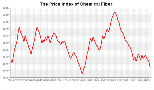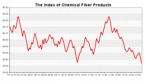 According to the monitor of Chinese Department of Commerce-Shengze Silk Chemical Fiber Index, the indexes of chemical fiber continued to decline. Hereinto, the total index closed at 95.87 points, which declined 0.05 points compared with the previous trading day. The price index of chemical fabrics closed at 96.66 points, which went down 0.03 points. In addition, the price index of chemical fiber continued to slide, it closed at 96.12 points, which dropped 0.04 points compared with yesterday.