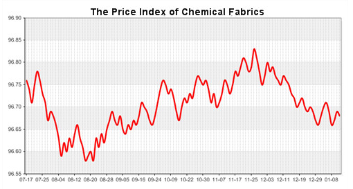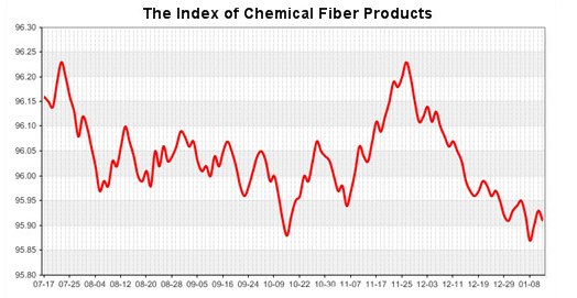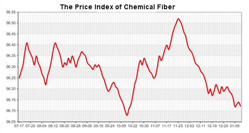 According to the monitor of Chinese Department of Commerce-Shengze Silk Chemical Fiber Index, the price index of chemical fiber went weak. At present, the total index of chemical fiber products was closed at 95.89 points, decreased 0.02 point than the previous trading day, the price index of chemical fabric was closed at 96.66 points and fell back 0.02 point than the previous trading day and the price index of chemical fiber was closed at 96.11 points, down 0.01 point than the previous trading day.