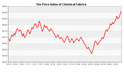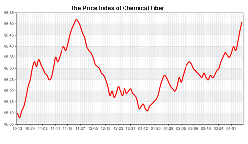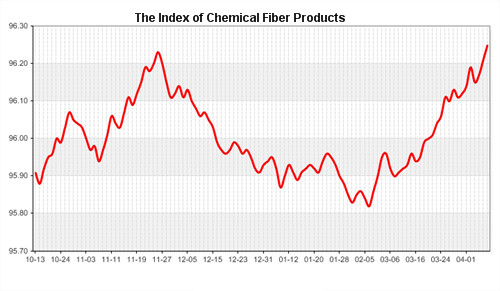 According to the monitor of Chinese Department of Commerce-Shengze Silk Chemical Fiber Index, the indexes of chemical fiber went up. Hereinto, the total index closed at 96.25 points, which went up 0.04 points compared with the previous trading day. The price index of chemical fabric s closed at 96.91 points, which went up 0.03 points. In addition, the price index of chemical fiber went up, and it closed at 96.51 points, which went up 0.04 points compared with last trading day.