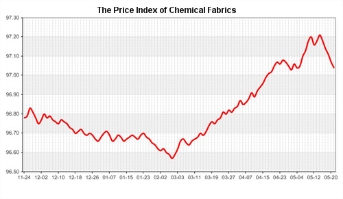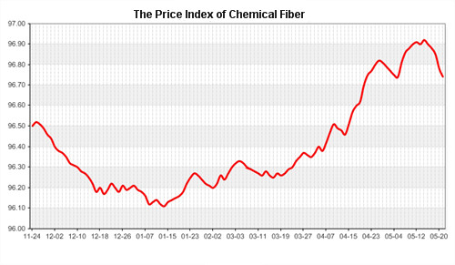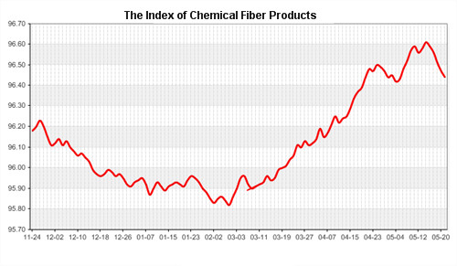 According to the monitor of Chinese Department of Commerce-Shengze Silk Chemical Fiber Index, the indexes of chemical fiber went down. Hereinto, the total index closed at 96.44 points, which went down 0.03 points compared with the previous trading day. The price index of chemical fabric s closed at 97.04 points, which went down 0.03 points. In addition, the price index of chemical fiber went down, and it closed at 96.74 points, which went down 0.04 points compared with last trading day.
