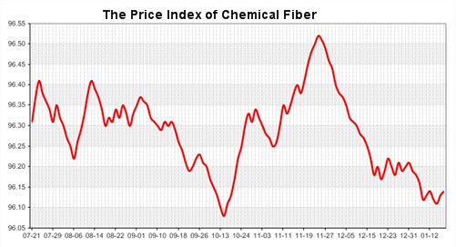 According to the monitor of Chinese Department of Commerce-Shengze Silk Chemical Fiber Index, the price index of chemical fiber decreased slightly. At present, the total index of chemical fiber products was closed at 96.01 points, decreased 0.01 point than the previous trading day, the price index of chemical fabric was closed at 96.34 points and increased 0.01 point than the previous trading day and the price index of chemical fiber decreased slightly and was closed at 96.93 points, down 0.03 point than the previous trading day.