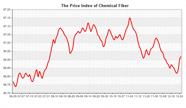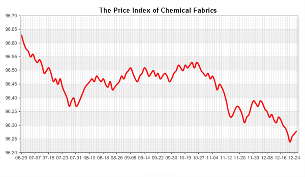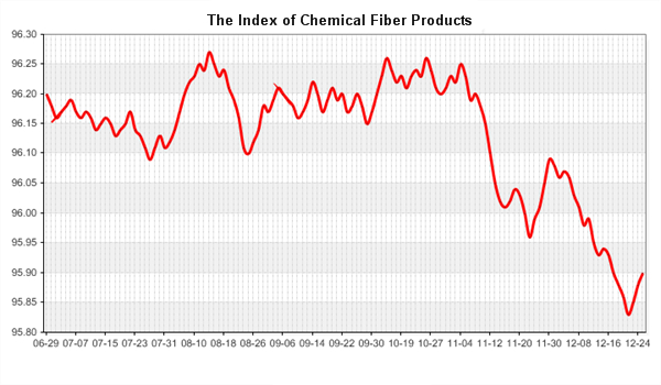 According to the monitoring analysis from 350 inquired enterprises, Chinese Department of Commerce-Shengze Silk Chemical Fiber Index went up this week. Hereinto, the total index closed at 95.90 points, which went up 0.02 points. The price index of chemical fabrics closed at 96.28 points, which went down 0.01 point than last week. In addition, the price index of chemical fiber went up, and it closed at 96.92 points, which went up 0.07 points compared with last week.
