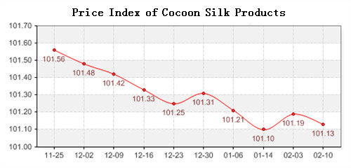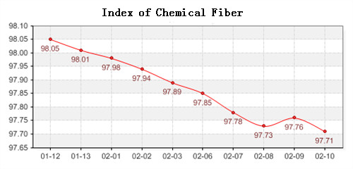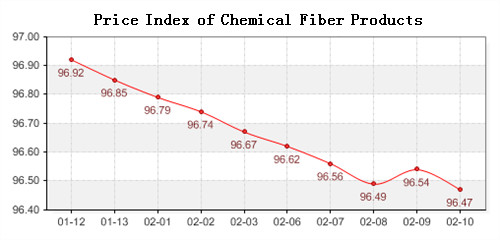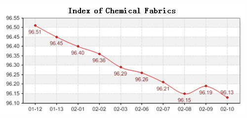 China Ministry of Commerce-Shengze Silk and Chemical Fiber which the total index decreased 0.2 points in February 6th-10th, 2012, closed at 96.47 points, among them, the price index of chemical fabric fall 0.16 points, closed at 96.13 points, the index of chemical fiber closed at 97.71 points, decreased 0.18 points compared with last week, while the price index of cocoon silk closed at 101.13 points, fall 0.06 points compared with last week.