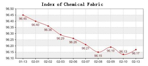 February 13th, 2012, according to China Ministry of Commerce-Shengze Silk and Chemical Fiber showed that the chemical fiber index was rebounded slightly, closed at 96.49 points compared with last Friday, up 0.02 points. Among them, the price index of chemical fabric raised 0.04 points compared with last Friday, closed at 96.17 points, and the price index of chemical fiber closed at 97.64 points, fall 0.07 points compared with last Friday.