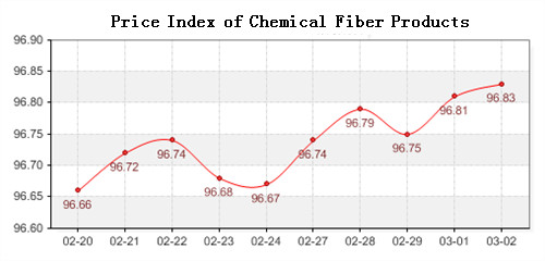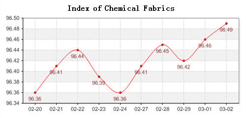 According to the monitor of Chinese Department of Commerce-Shengze Silk Chemical Fiber Index showed that the total index went higher this week, among which the total index of chemical fiber closed at 96.83 points, up 0.16 point compared with last weekend, the price index of chemical fabric closed at 96.49 points, up 0.13 points, the index of chemical fiber closed at 97.73 points, up 0.12 points, and the price index of cocoon silk products continued the rising trends, closed at 101.18 points, up 0.08 points compared with last weekend.