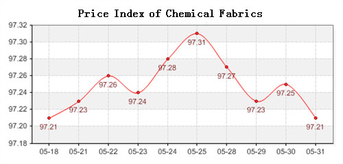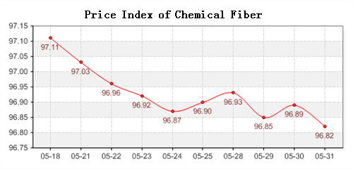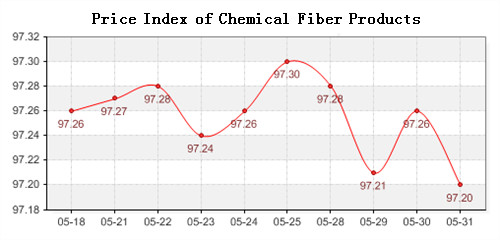 According to the monitor of Chinese Department of Commerce-Shengze Silk Chemical Fiber Index, the index of chemical fiber products showed the downward tendency. Among which the price index of chemical fiber fell 0.06 points compared with the previous trading day, closed at 97.20 points, the price index of chemical fabric rose to 0.04 points, closed at 97.21 points, and the price index of chemical fiber dropped 0.07 points compared with the previous trading day, closed at 96.82 points,