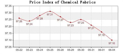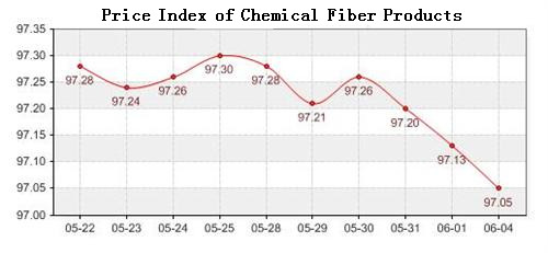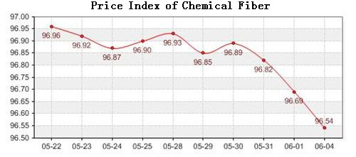 According to the monitor of Chinese Department of Commerce-Shengze Silk Chemical Fiber Index, the index of chemical fiber products continued to the downward tendency. Among which the total index of chemical fiber fell 0.08 points compared with last Friday, closed at 97.05 points, the price index of chemical fabrics dropped 0.06 points, closed at 97.10 points, and the price index of chemical fiber declined 0.15 points compared with last Friday, closed at 96.54 points.