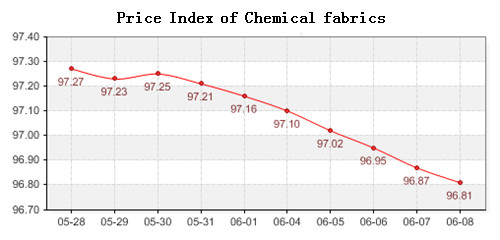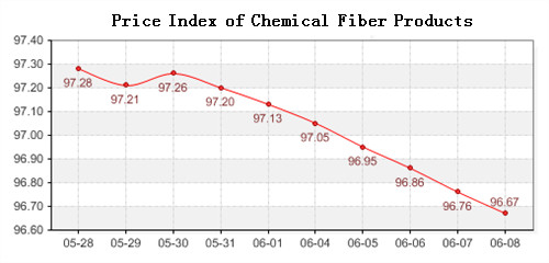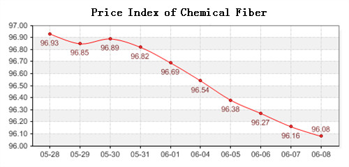 According to the monitor of Chinese Department of Commerce-Shengze Silk Chemical Fiber Index, the index of chemical fiber products continued to the downward tendency. Among which the total index of chemical fiber closed at 96.67 points, decreased 0.09 points than last trading day, the price index of chemical fabric also continued to the sluggish trends and closed at 96.81 points, fell 0.06 points, and the price index of chemical fiber closed at 96.08 points, dropped 0.08 points than last trading day.