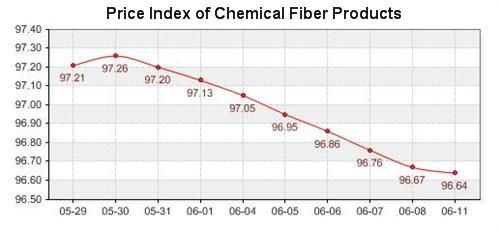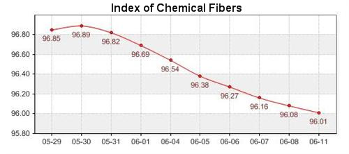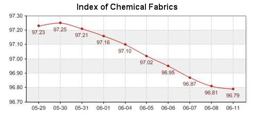 According to the monitor of Chinese Department of Commerce-Shengze Silk Chemical Fiber Index, the indexes of chemical fiber followed last week’s declining tendency, but the falling speed turned slow. The total chemical fiber index closed at 96.64 points, which dropped 0.03 points compared with last Friday. Among the indexed, the price index of chemical fabrics closed at 96.79 points, which declined 0.02 points compared with last Friday. In addition, the chemical fiber index closed at 96.01, which fell 0.11 points compared with last Friday.