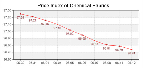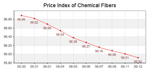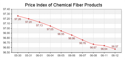 According to the monitor of Chinese Department of Commerce-Shengze Silk Chemical Fiber Index, the indexes of chemical fiber all slid. The total chemical fiber index closed at 96.57 points, which dropped 0.07 points compared with previous trading day. Hereinto, the price index of chemical fabrics closed at 96.74 points, which declined 0.05 points compared with yesterday. In addition, the chemical fiber index closed at 95.92 points, which fell 0.09 points compared with yesterday.