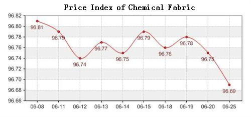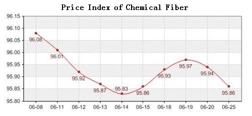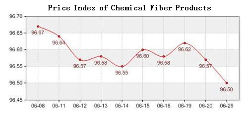According to the monitor of Chinese Department of Commerce-Shengze Silk Chemical Fiber Index, the index of chemical fiber products continued to the downward tendency. Among which the total index of chemical fiber closed at 96.50 points, decreased 0.07 points than last trading day, the price index of chemical fabric closed at 96.69 points, fell 0.06 points than last trading day, and the price index of chemical fiber closed at 95.86 points, dropped 0.08 points than last trading day.