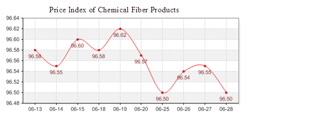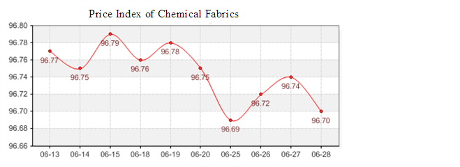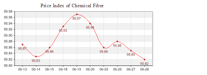 According to the monitor of Chinese Department of Commerce-Shengze Silk Chemical Fiber Index, the indexes of chemical fiber begin to drop. The total chemical fiber index closed at 96.50 points, which dropped 0.05 points compared with the last trading day. Hereinto, the price index of chemical fabrics closed at 96.70 points, which dropped 0.04 points compared with the last trading day. In addition, the chemical fiber index closed at 95.82 points, which dropped 0.03 points compared with the last trading day.