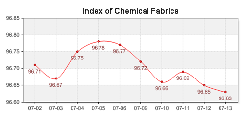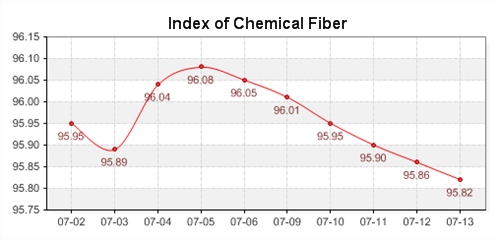 According to the monitor of Chinese Department of Commerce-Shengze Silk Chemical Fiber Index, the indexes of chemical fiber totally decreased. The total chemical fiber index closed at 96.04 points, which decreased 0.03 points compared with last trading day. Among the indexes, the price index of chemical fabrics closed at 96.63 points, which slid 0.02 points. In addition, the chemical fiber index kept dropping for the sixth trading day. It closed at 95.82, which decreased 0.04 points than last trading day.