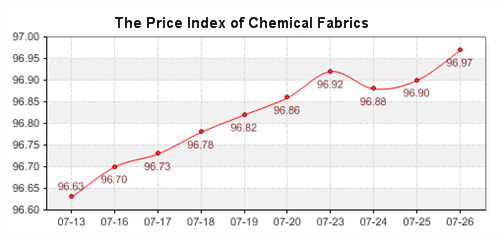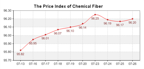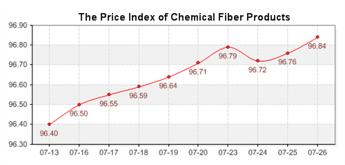 According to the monitor of Chinese Department of Commerce-Shengze Silk Chemical Fiber Index, the indexes of chemical fiber increased slightly. Hereinto, the price index of chemical fiber products closed at 96.84points, which increased 0.08 points compared with the previous trading day. The price index of chemical fabrics closed at 96.97 points, which raised 0.07 points. In addition, the price index of chemical fiber closed at 96.20 points, which up 0.03 points compared with the previous trading day.