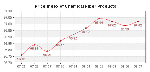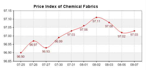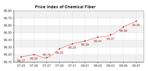 According to the monitor of Chinese Department of Commerce-Shengze Silk Chemical Fiber Index, the indexes of chemical fiber continue to increase. Hereinto, the total index closed at 97.02 points, which increased 0.03 points compared with the previous trading day. The price index of chemical fabrics closed at 97.03 points, which raised 0.01 points compared with yesterday. In addition, the price index of chemical fiber closed at 96.66 points, which up 0.08 points compared with yesterday.