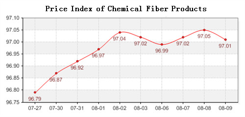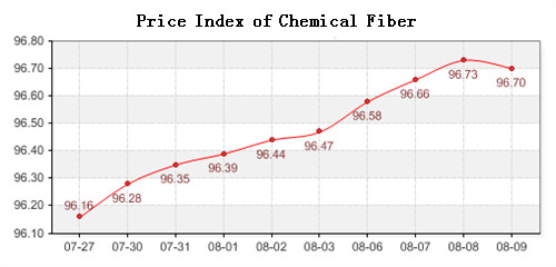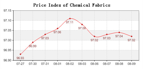 According to the monitor of Chinese Department of Commerce-Shengze Silk Chemical Fiber Index, the price index of chemical fiber rebounded slightly. At present, the index of chemical fiber products was closed at 97.01 points, decreased 0.04 point than the previous trading day, the price index of chemical fabric was closed at 97.02 points and declined 0.02 points than the previous trading day and the price index of chemical fiber was closed at 96.70 points, down 0.03 points than the previous trading day.