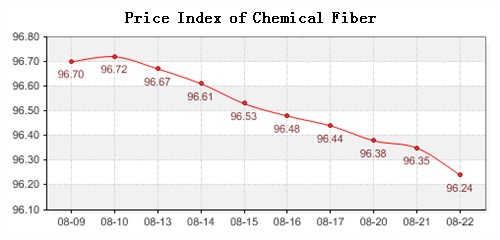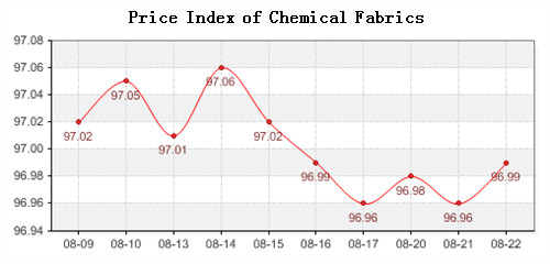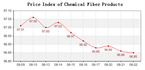 According to the monitor of Chinese Department of Commerce-Shengze Silk Chemical Fiber Index, the price index of chemical fiber followed the rising trends. At present, the total index of chemical fiber products was closed at 96.85 points, decreased 0.01 point than the previous trading day, the price index of chemical fabric was closed at 96.99 points and fell back 0.03 points than the previous trading day and the price index of chemical fiber was closed at 96.24 points, down 0.11 points than the previous trading day.